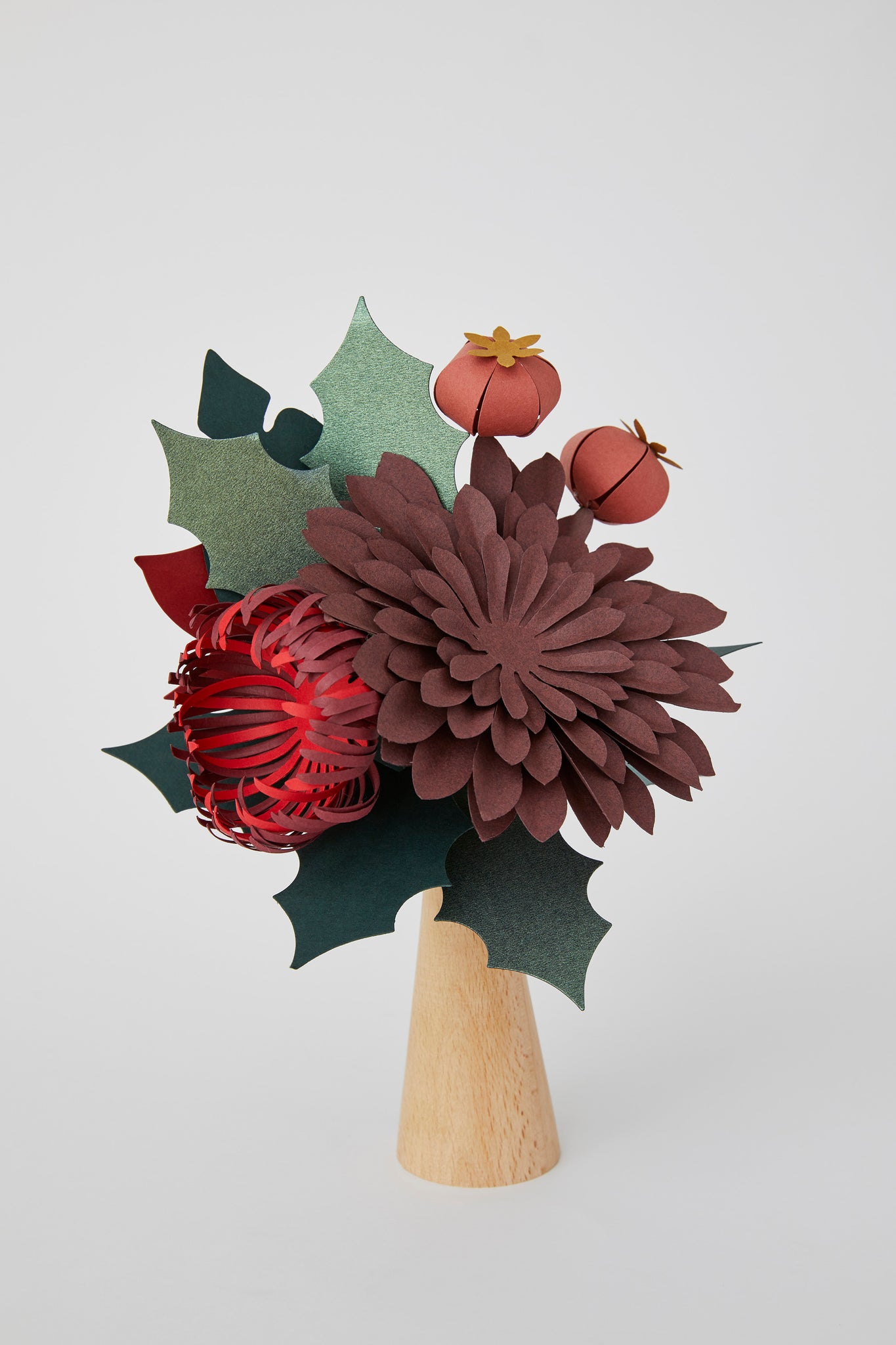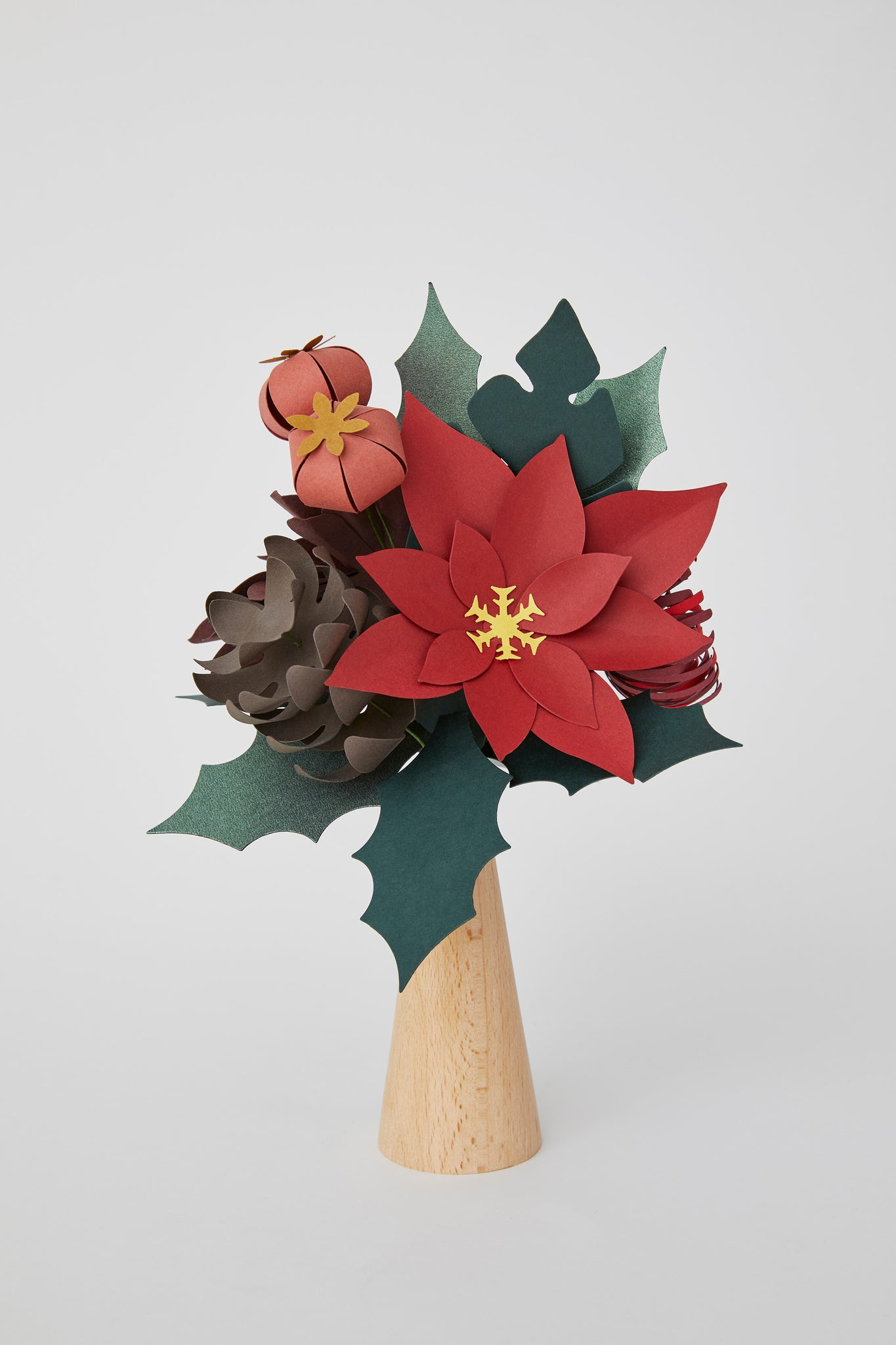 Kağıt Çiçek Buket İçeriği: Poinsettia (Atatürk Çiçeği), dalya, kozalak, minik narlar, spider mum, ve yeşillikler.